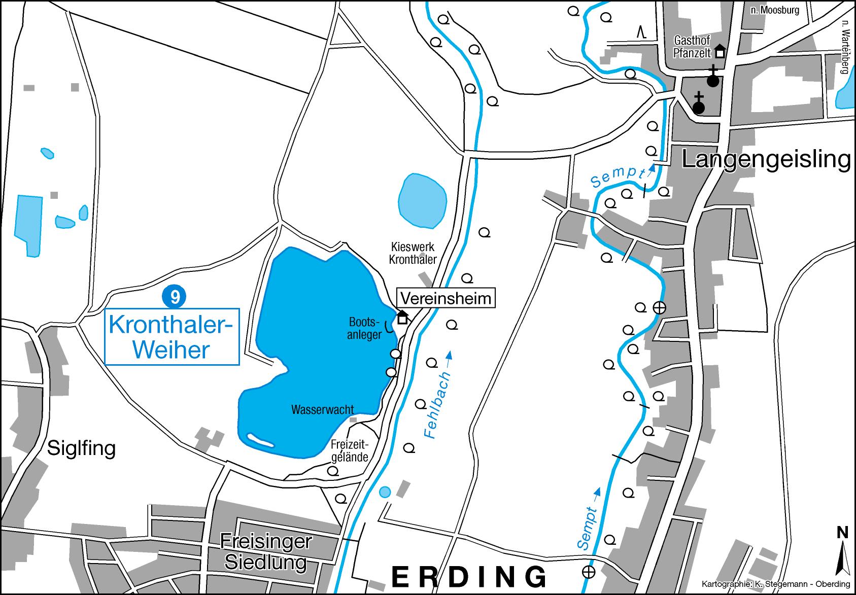Der Kronthaler Weiher liegt unmittelbar an der nördlichen Peripherie der Stadt Erding.